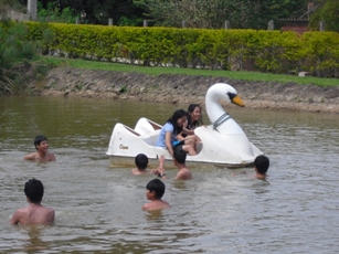 スワンから引きずり降ろそうとする男の子。さしずめ、ボートをねらうサメのようです。