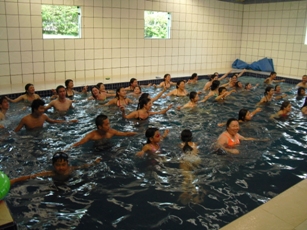 みんなで雪崩(なだれ)式にプールに飛びこみます(落ちます)。